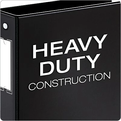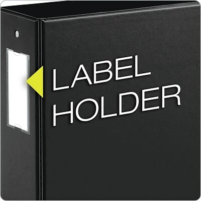A clear spine pocket holds custom-made labels that identify the contents of the Cardinal 200-sheet black binder when it is on the shelf or stacked with other binders