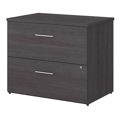 The Bush Business Furniture Office 500 two-drawer lateral file cabinet offers secure storage with a sophisticated look that fits the modern workplace. Organize important paperwork safely and efficiently with this lateral file cabinet. A great addition to any workspace, this file cabinet features two large drawers that accept legal-, letter-, and A4-size documents while supporting up to 88 lbs. each. Both drawers open on full-extension ball bearing slides for an easy reach to contents and are secured by a single lock to protect files that contain sensitive information. Drawers open one at a time for maximum stability, and the base includes adjustable levelers to compensate for uneven floors. One file cabinet accepts the coordinating 36″W bookcase hutch while two can accept a 72″W desk hutch (hutches sold separately). This locking file cabinet meets or exceeds ANSI/BIFMA quality standards for safety and performance and is backed by a 10-year manufacturer limited warranty. American-made with US and imported parts.
