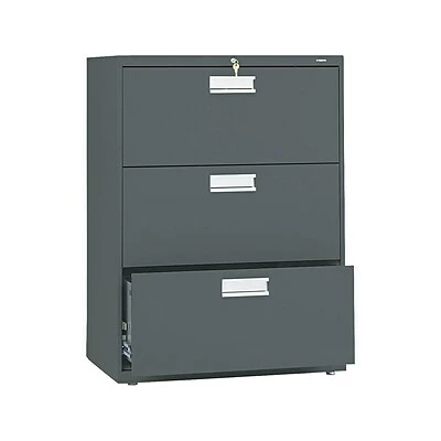 Create a more efficient filing system with this HON Brigade 600 Series lateral file cabinet. Three large drawers accept letter and legal documents for flexible storage options, and a mechanical interlock prevents more than one drawer from being opened at the same time. A removable core lock system provides added security for sensitive documents. This HON Brigade 600 Series lateral file cabinet features all-welded case construction for strength and durability.