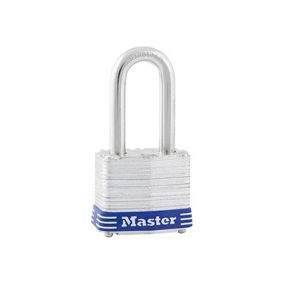 Lock up storage bays, gates and valuables with this strong laminated padlock. The 1.5-inch clearance offers versatility, while the hardened steel shackle makes it resistant to cutting or sawing for enhanced protection. The four-cylinder pin helps preventpicking, and the dual locking system prevents people from prying it open. This Master Lock non-rekeyable laminated padlock has a wide laminated steel body for extra strength.