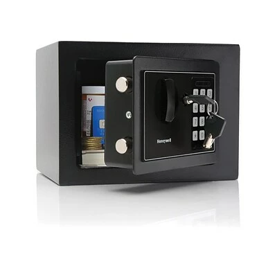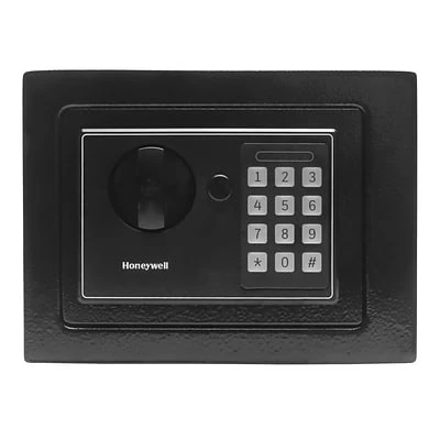 Secure some much-needed peace of mind when it comes to safeguarding your small valuables with this black steel digital security box. Specifically designed to safeguard small items, such as money, wallets, passports, jewelry, prescription drugs, and a collection of other valuable items, this Honeywell steel security box offers a series of safety enhancement features. The presentation of this series has seen an upgrade in the visual department, as the security box blends the best attributes of a sleek and compact design. A welcomed addition for small spaces, such as home offices, bedrooms, dorm rooms, and other small living areas, this compact security box is as versatile as it is tough.