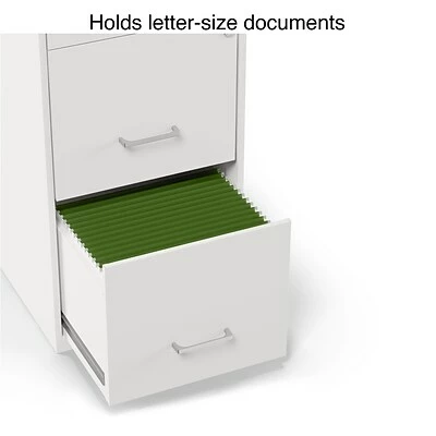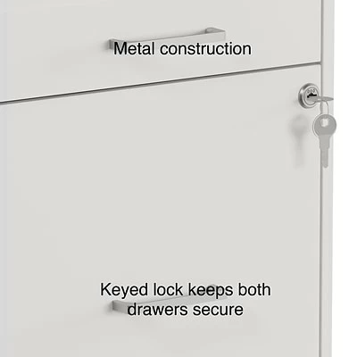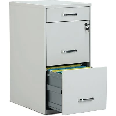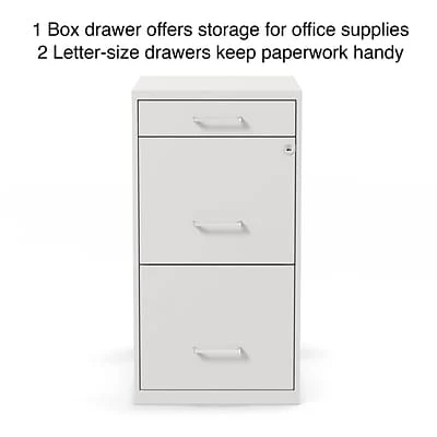 Get a space-efficient solution to recordkeeping and document storage with this three-drawer light duty vertical file cabinet. Ideal for organizing offices, the top drawer provides space for storing supplies, and the bottom two drawers accommodate a large number of letter-size files. The compact design lets this cabinet fit in small spaces, while the white finish and polished handles enhance office decor. This utility file cabinet keeps stored items secure with a built-in lock.