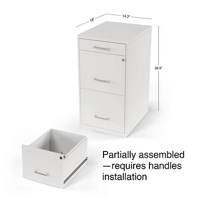 Organize your home or professional workspace with the Staples 3-Drawer vertical utility file cabinet. Stow away all your important documents and office supplies in 3 spacious 18″ depth drawers. This file cabinet comes equipped with one factory installed lock and key, controlling the top two drawers for peace of mind and security. The modern white finish and polished handles keep your office space looking contemporary and organized. This cabinet is backed by a 7-year limited warranty, keeping you satisfied for years to come