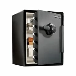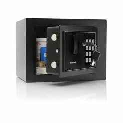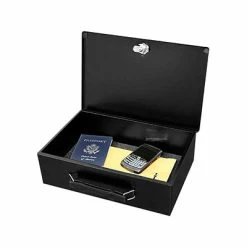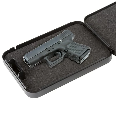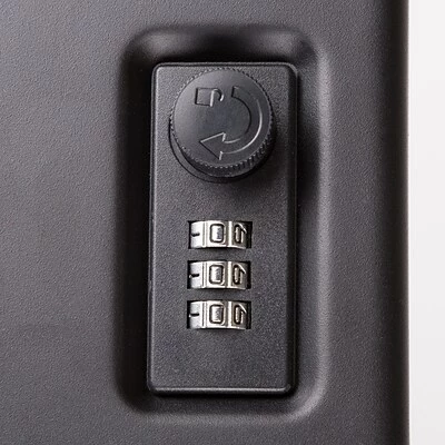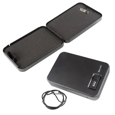 Safeguard your standard sized pistol, ammunition, cash, passport, jewelry and other valuables in this Compact Combination Lockbox by Stalwart. This lockbox features a sold steel construction in a compact lightweight design for easy portability. This is the perfect lockbox to keep guns out of the wrong hands and valuables out of sight. Simply enter your own code to unlock the lockbox. Included is a 1500 pound tested self-locking security cable to secure your lockbox to any stationary object. A thick protective foam interior will protect your most valuable possessions in the event of a disaster, theft or invasion of your home or office.